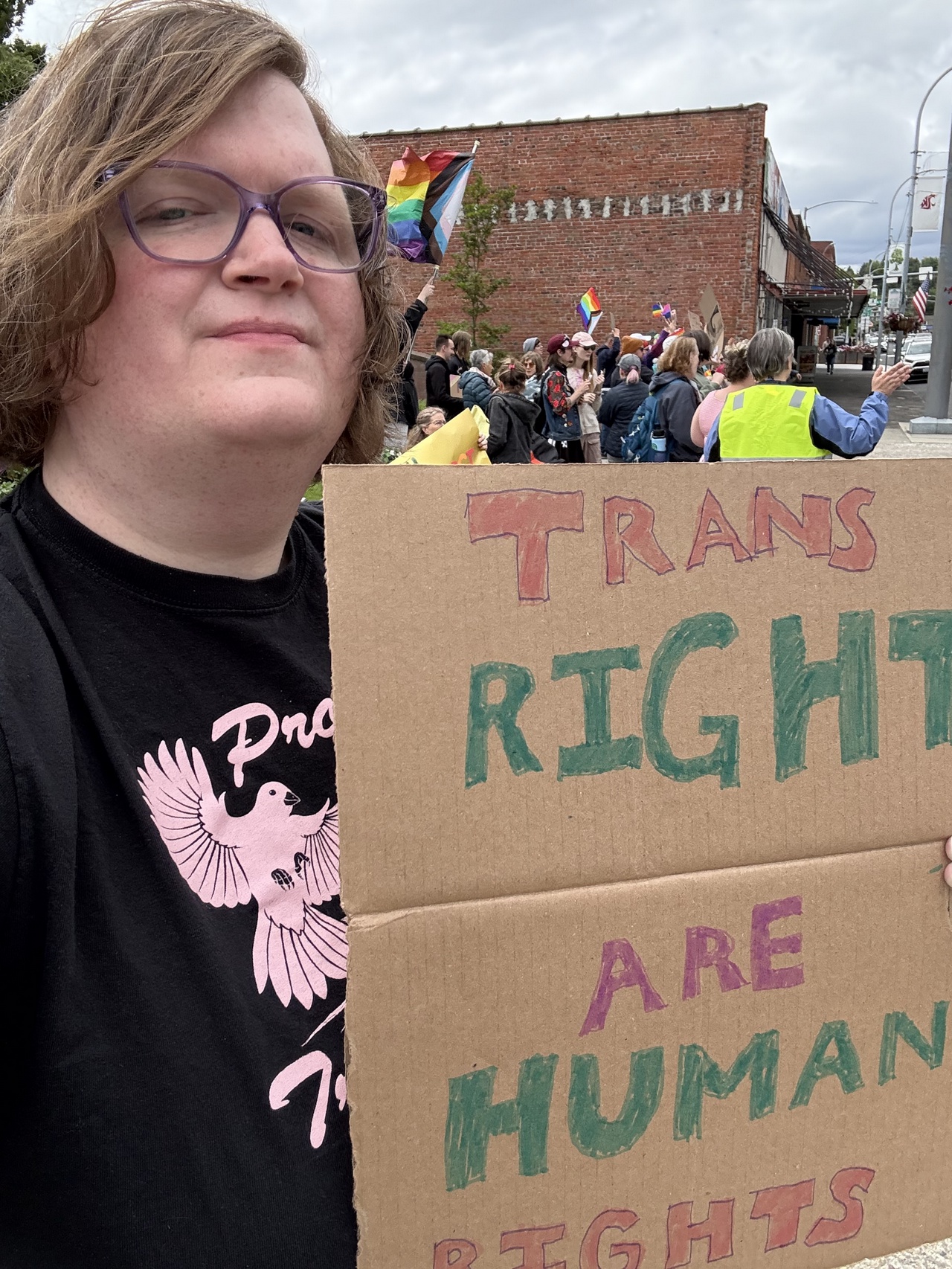 There was one person at Pullman Pride, with a cart festooned with No Kings signs, who kept trying to get a chant of “we’re here, we’re queer, we’re harmless” going. No, ma’am. Respect our existence or expect our resistance.